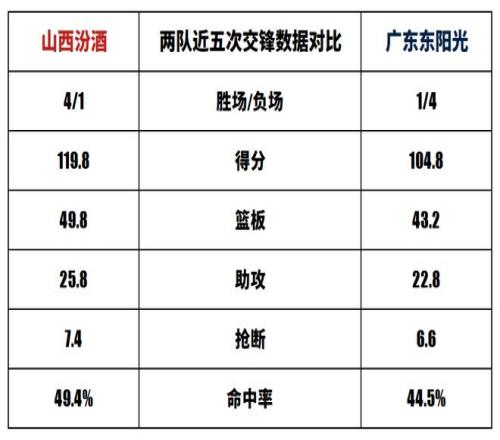 山西汾酒与广东东阳光历史上一共交手48次,山西汾酒10胜38负。上赛季两队交手7次,山西汾酒6胜1负。