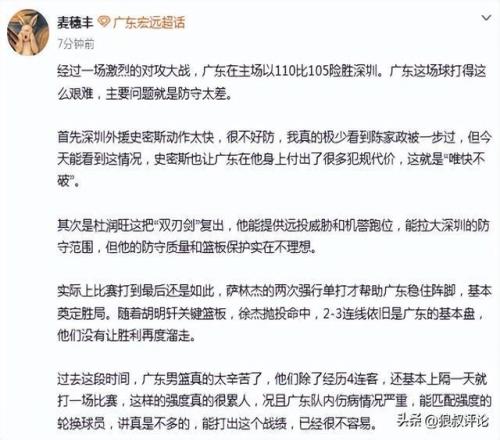 媒体人“麦穗丰”发文:广东这场球打得这么艰难,主要问题就是防守太差。