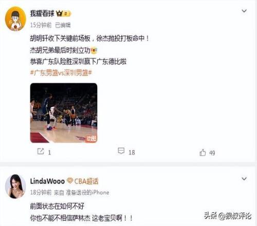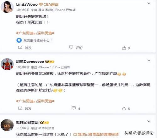 媒体人“周鹏”发文点评:胡明轩的关键前场篮板,徐杰的关键打板命中,广东锁定胜局。