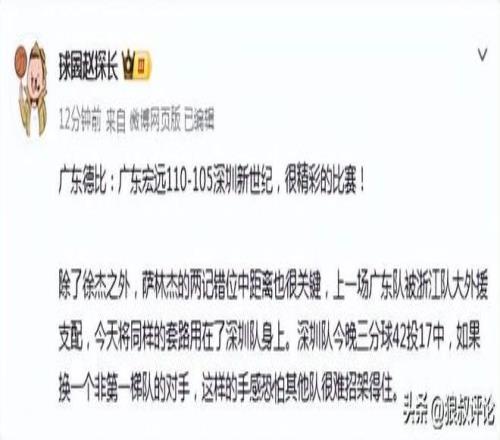 媒体人“赵探长”发文点评:广东德比:广东宏远110-105深圳新世纪,很精彩的比赛。